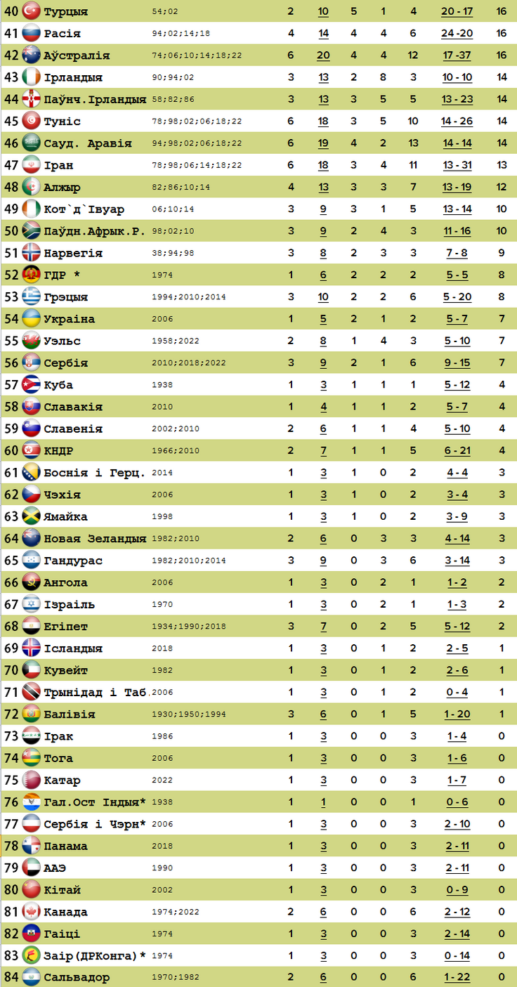 22 розыгрышы, 84 удзельнікі, 1414 матчаў. Зводная табліца ўсіх чэмпіянатаў свету