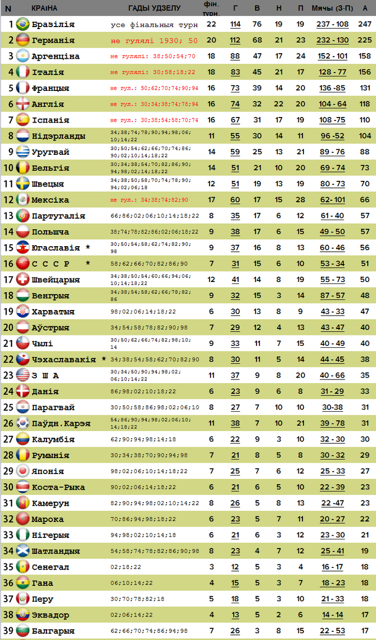 Зводная табліца фінальных частак чэмпіянатаў свету па футболе (1930-2022)